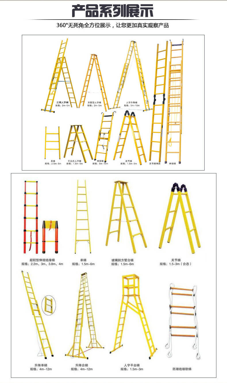 電工專用絕緣梯分為:絕緣單梯、升降單梯、絕緣合梯、升降合梯、人字平臺梯、絕緣關節梯、超輕型伸縮絕緣梯、絕緣軟梯、絕緣關節梯、絕緣抱桿梯、絕緣魚竿梯等。